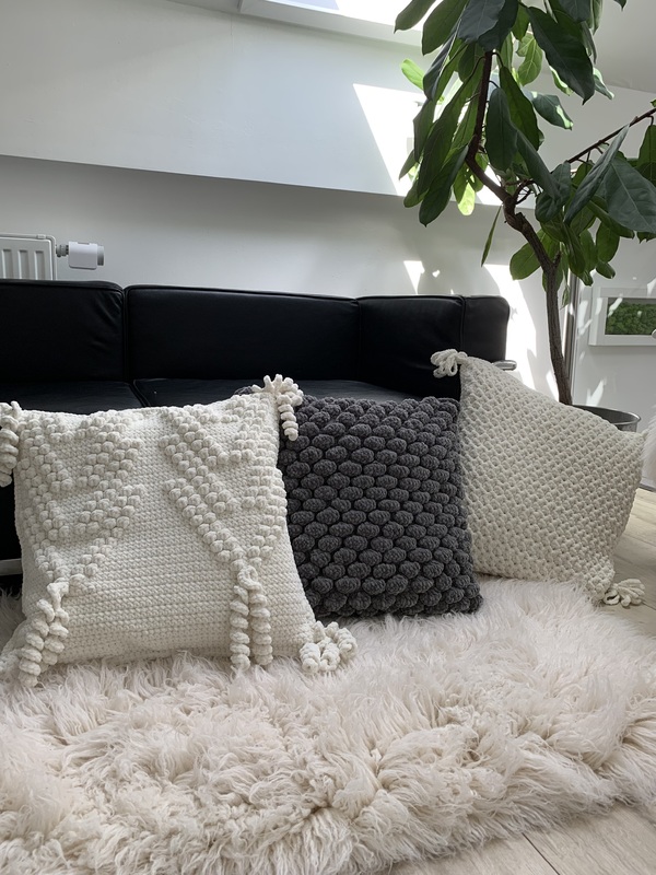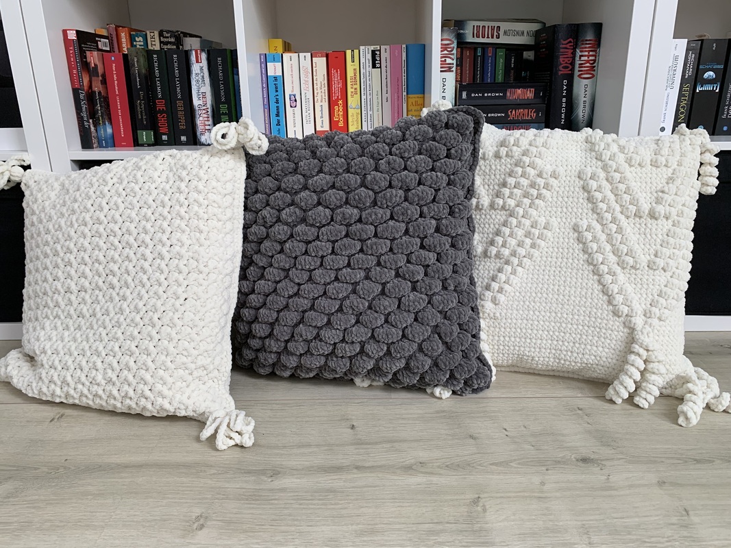 Du bekommst die Häkel-Anleitung für drei verschiedene Kissenplatten („Wölkchen, Makramee, Knubbelig“) und die Rückseite, die du für alle Kissenplatten verwenden kannst.