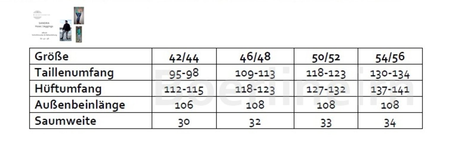 Mit dieser Anleitung und dem Schnittmuster nähst du dir eine bequeme und auch alltagstaugliche Schlupf-Hose, Jeggings oder Treggings in den Gr. 42 - 56. Die Hose hat einen hoch geschnittenen Bund, damit sie in allen Gelegenheiten auch dort sitzen bleibt, wo sie hingehört. Dadurch ist es auch möglich, sie für die ersten Schwangerschaftsmonate zu nutzen. Dies wurde auch im Probenähen getestet. Natürlich hast du die Möglichkeit, den Hosenbund auch etwas tiefer zu setzen. Genäht werden kann diese Hose aus allen elastischen Webwarestoffen wie Jeans oder Cord, aber auch Popeline und andere Stoffe kommen infrage, wobei der Elasthananteil im Stoff mindestens 2–5 % betragen sollte. Du benötigst pro Hose ca. 2 - 2,5 m Stoff ausgehend von einer Körpergröße von ca. 1,70 m.