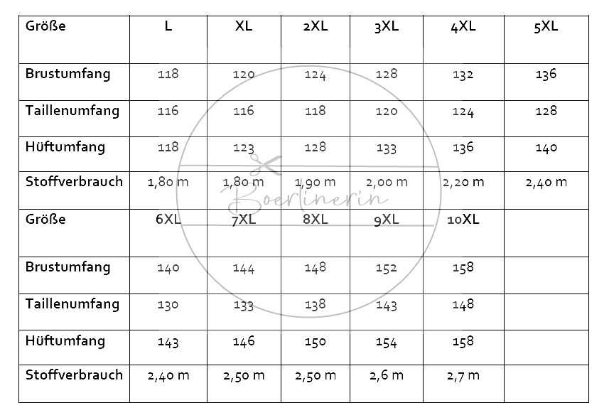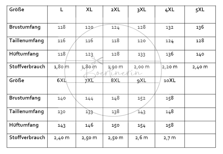 Eine Maßtabelle mit den Stoffverbrauchswerten findet ihr bei den Fotos in der Vorschau.