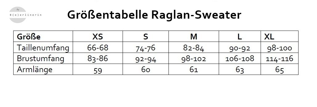 Mit dieser Anleitung und dem Schnittmuster kannst du dir einen Raglansweater nähen in den Gr. XS - XL. Genäht werden können die Kleidungsstücke aus allen dehnbaren Stoffen, z.B. dickerer Jersey, Sweatshirtstoff oder auch kuschliger Strickstoff. Auch Nähanfänger kommen mit dieser Anleitung wunderbar zurecht. Die einzelnen Nähschritte sind ausführlich und bebildert beschrieben.