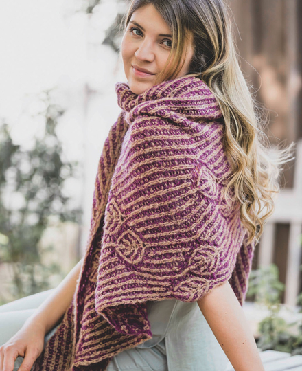 Junghans-Wolle „Arequipa“ (42 % Alpaka, 40 % Schurwolle, 16 % Polyamid, 2 % Elasthan, Lauflänge ca. 275 m/50 g): je 150 g Camel (Fb 135-077-09) und Pflaume (Fb 135-083-09)