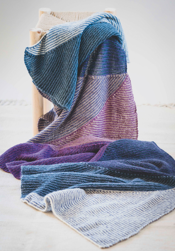 Lana Grossa „Lace Seta“ (70 % Alpaka, 30 % Seide Lauflänge ca. 250 m/50 g): je 100 g Dunkelpetrol (Fb 37) und Blauviolett (Fb 19) und je 50 g Violett (Fb 30), Taupe (Fb 6), Blaulila (Fb 8), Rohweiß (Fb 1) und Jeans (Fb 28)