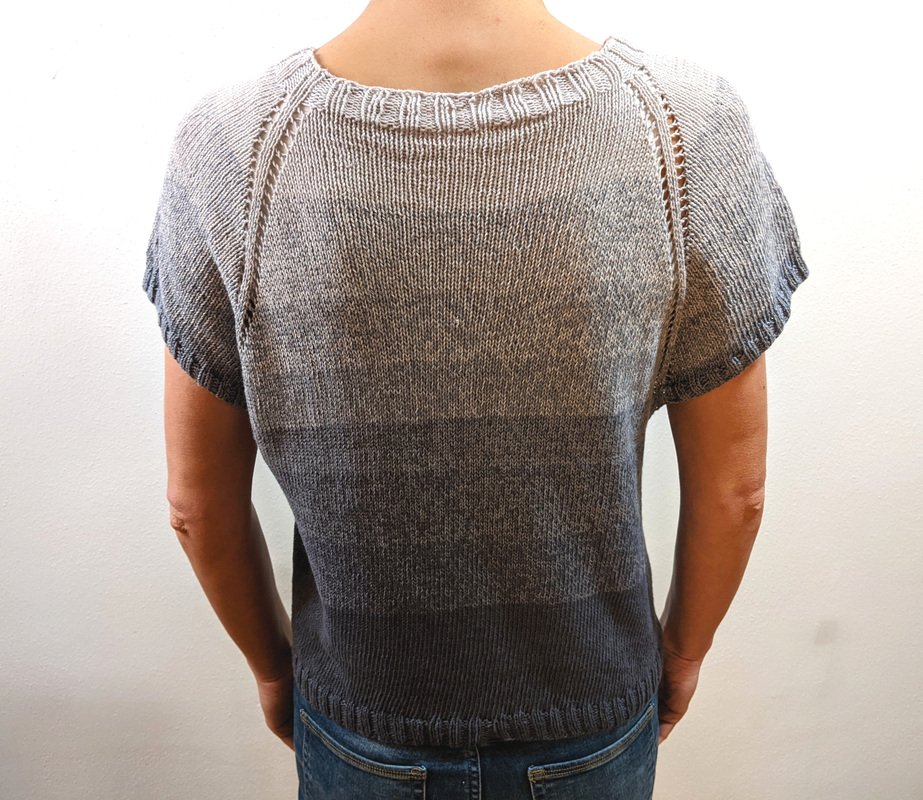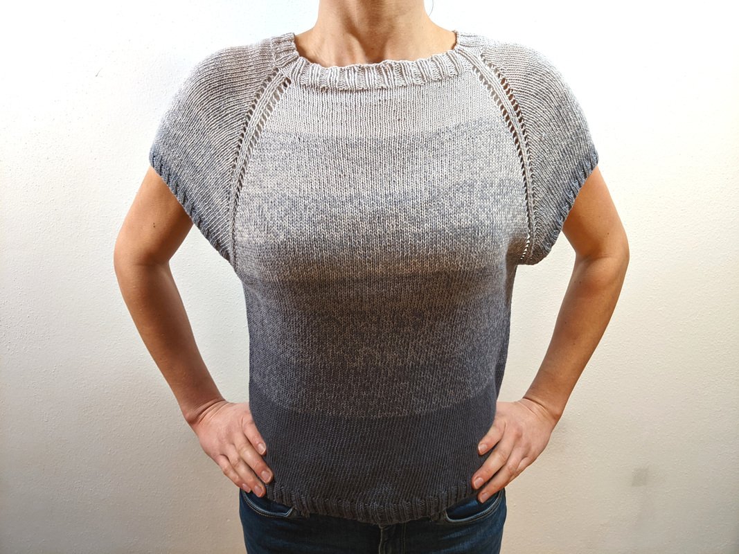 Einfaches Shirt mit kurzen schrägen Ärmeln aus einem dünnen Sommer-Baumwollgarn. Es wird von oben nach unten in einem Stück gestrickt, wodurch der Farbverlauf von hellgrau über dunkelgrau bis hin zu einem dunklen Blauton sehr gut zur Geltung kommt. Durch die Raglanzunahmen entsteht als besonderer Hingucker eine dekorative Lochmusterlinie.