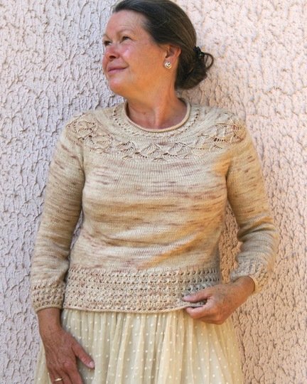 Originalgarn Pullover: Mondlichtgarne 80 % Schurwolle (Merino)/ 10 % Kaschmir, 10 % Polyamid, LL 400 m/100 g, gezeigt in der Farbe „Saharasand“
