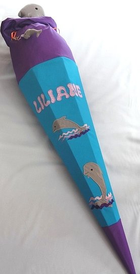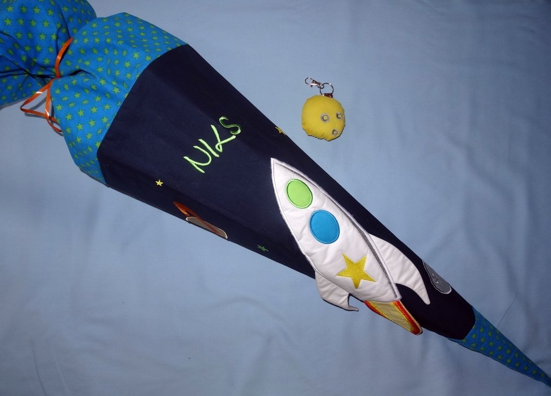 An Stoff braucht ihr ca. 10cm mehr als die Höhe der Schultüte und für den Verschluss ca. 5 bis 10cm mehr als die Hälfe der Höhe der Schultüte.