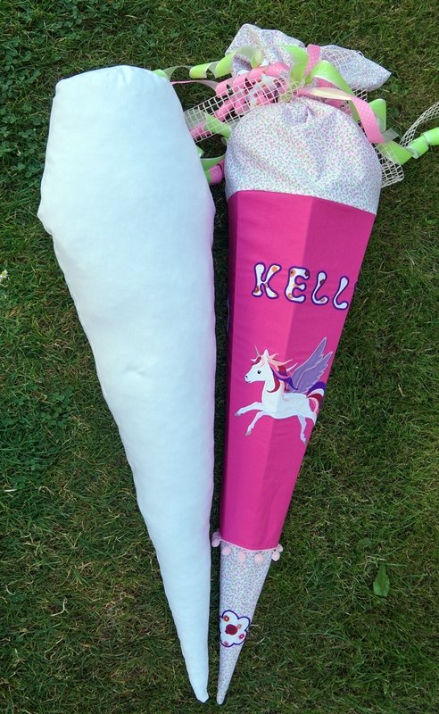Für das Innenkissen benötigt ihr ca. 15-20cm mehr als die Höhe der Schultüte und Faserbällchen Füllwatte. (Max. 77x 105cm bei 85cm Schultüten)