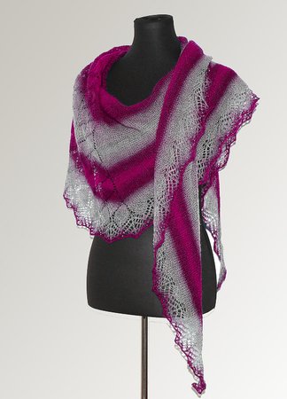 Es wird von oben nach unten gestrickt, gleichmäßige Zunahmen am Rand und innerhalb des Tuches ergeben die Form.