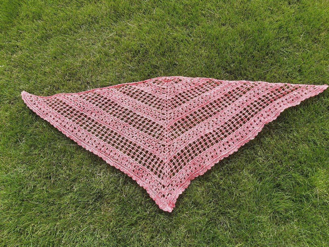 Mein Beispieltuch hat eine Spannweite von 1,94m und eine Tiefe von 0,90m. Gearbeitet wurde es mit einem 4-fädigen Bobbel (750m Lauflänge) und Nadelstärke 5.
