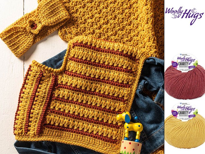 Gehäkelt wurde das Set aus der Woolly Hugs CHARITY. Die (natürlich mulesingfreie!) Qualität ist mit 100 m Lauflänge auf 50 g sehr vielseitig und besonders für Baby- und Kleinkind bestens geeignet, da es sich bei 40 Grad waschen lässt und speichelecht ist. Mit 24 verschiedenen Farben lässt die Farbpalette keine Wünsche offen.