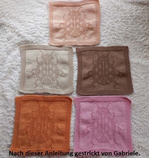 Eingestrickt ist das Motiv eines Marienkäfers, dem Glückskäfer.