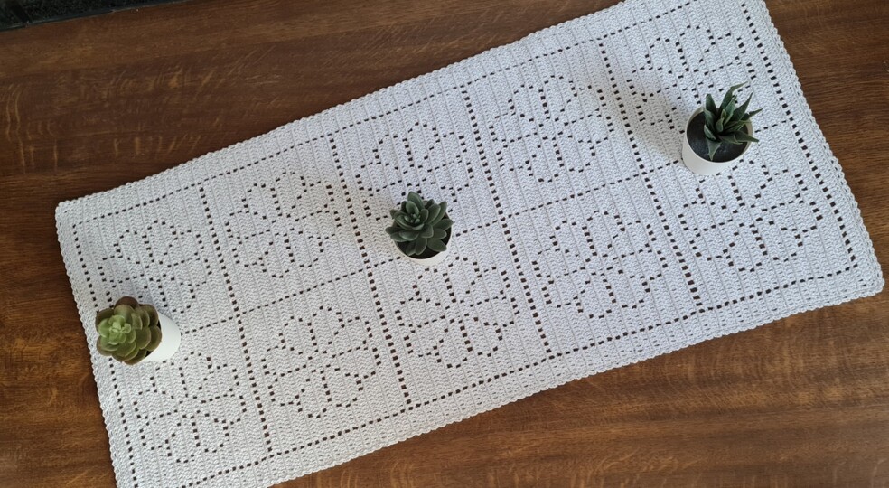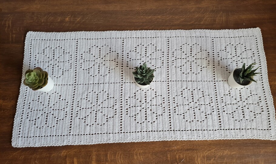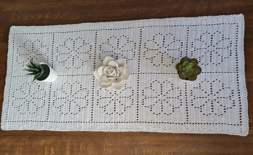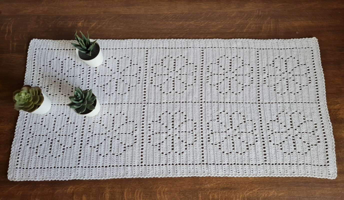 Es scheint, als ob er aus einzelnen Grannys gehäkelt wird, das täuscht. Der Tischläufer wird an einem Stück gehäkelt.