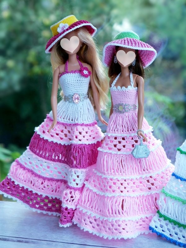 Ihr könnt die Puppenkleider in den Lieblingsfarben der Puppenmutti häkeln und nach Belieben verzieren. Schaut Euch gern meine Beispiele an. Zu jedem Modell habe ich die verwendeten Garne und Farben in der Anleitung aufgeführt. Auch meine Quellen für die Materialien habe ich mit angegeben.