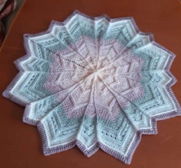 Der Durchmesser schwankt, je nachdem wie fest oder locker gehäkelt wird, zwischen 80 und 90 cm. Ich häkele eher fest und habe mit einer 3,75er Nadel einen Durchmesser von 83cm erreicht.