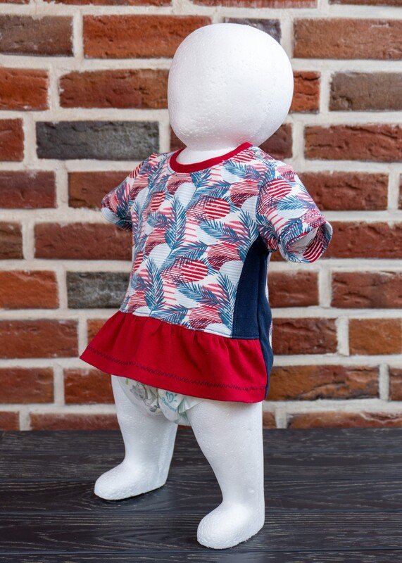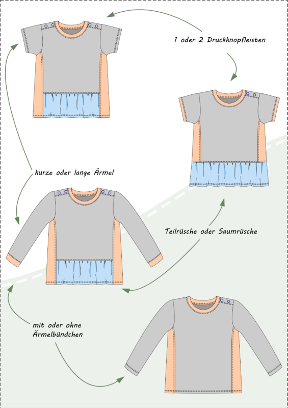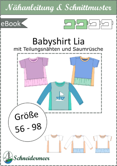 Das Modell „Lia“ ist ein Jerseyshirt für Babys mit Teilungsnähten an den Seiten und einer Saumrüsche am Vorderteil. „Lia“ kann mit oder ohne Saumrüsche genäht werden, sodass du ein schönes Basicshirt mit dem gewissen Etwas erhältst.