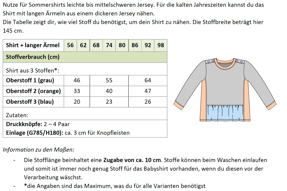 leichter bis mittelschwerer Jersey: je nach Größe und Modell zwischen 20 und 64 cm bei 145 Stoffbreite