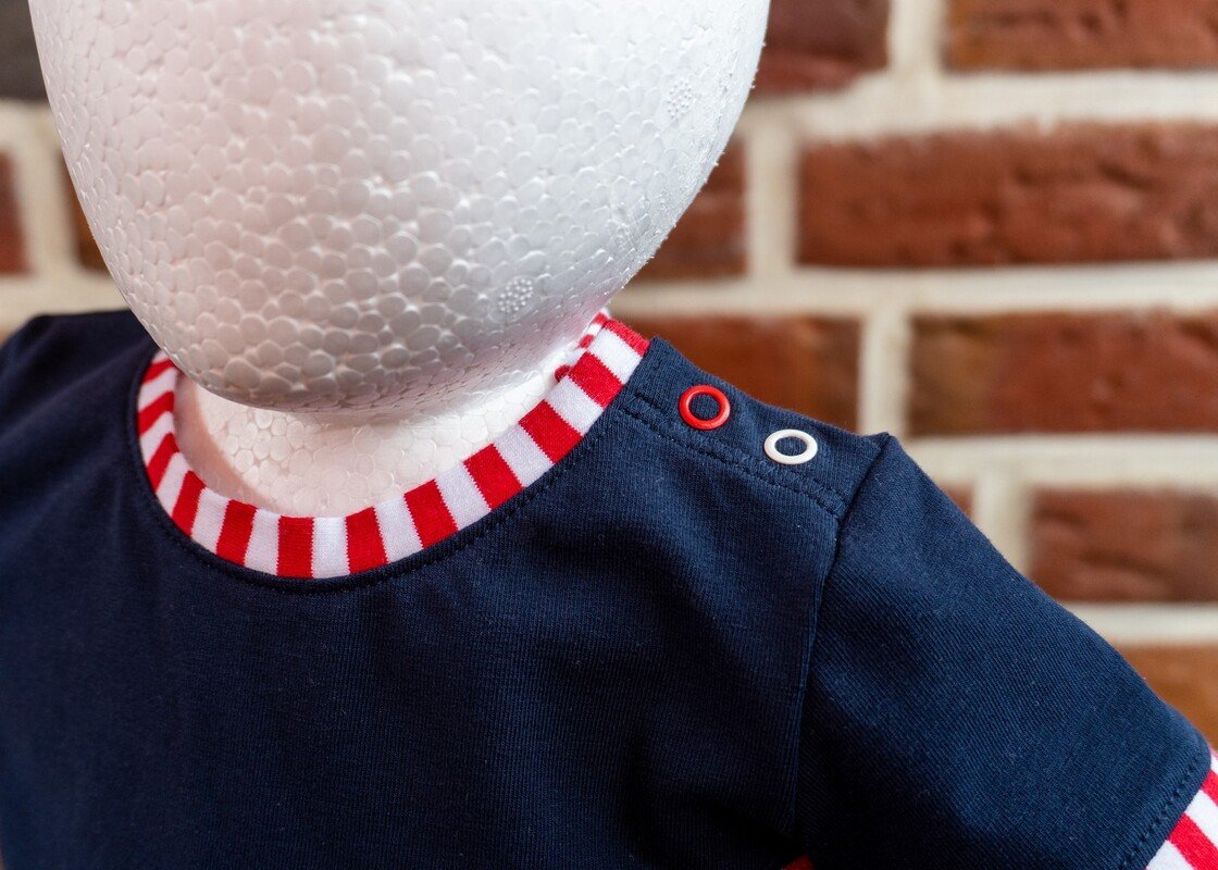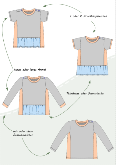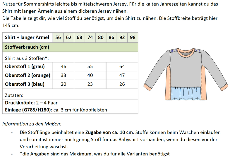 Im Schnittmuster sind gerade Ärmel mit einfachem Saum oder Saumbündchen enthalten. Außerdem hast du die Wahl zwischen 1 oder 2 Knopfleisten, um dem Baby das Anziehen des Shirts zu erleichtern. Beide Varianten werden ausführlich als Bild-für-Bild-Anleitung beschrieben, sodass auch Nähanfänger sich an das Shirt trauen können.