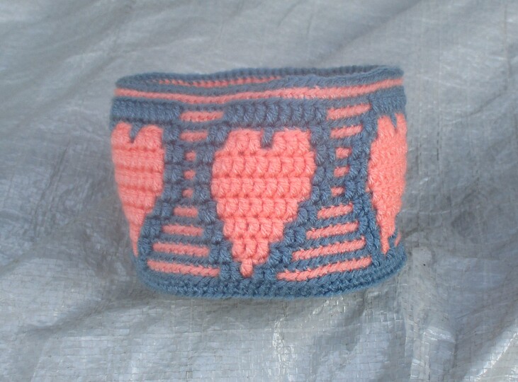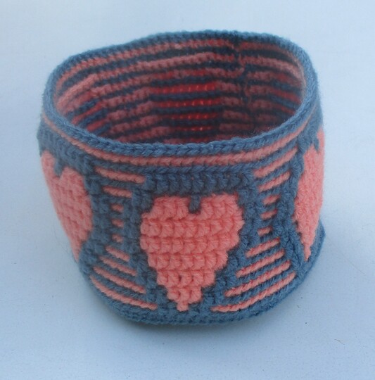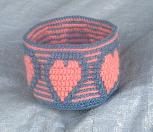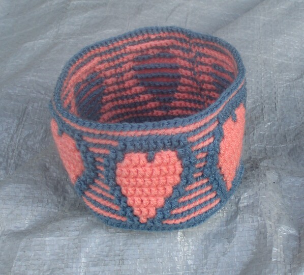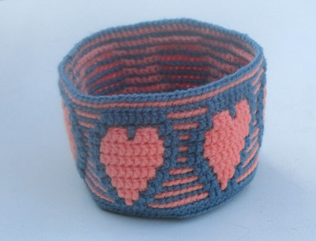 Eine Anleitung, wie ihr ein Utensilo mit Herzmuster in der Technik Mosaikhäkeln (mosaic crochet) in Runden herstellt.