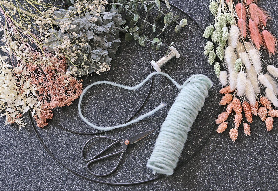 • 2 Metallringe in unterschiedlichen Größen (z. B. 20 cm und 40 cm Durchmesser), Schere, Wollkordel, Holzschild, Wickeldraht