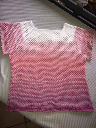 Bei Verwendung von Farbverlaufsgarn werden die Ärmel gleich nach dem Schließen angehäkelt und dann wird der Körperteil nach unten weiter gehäkelt.