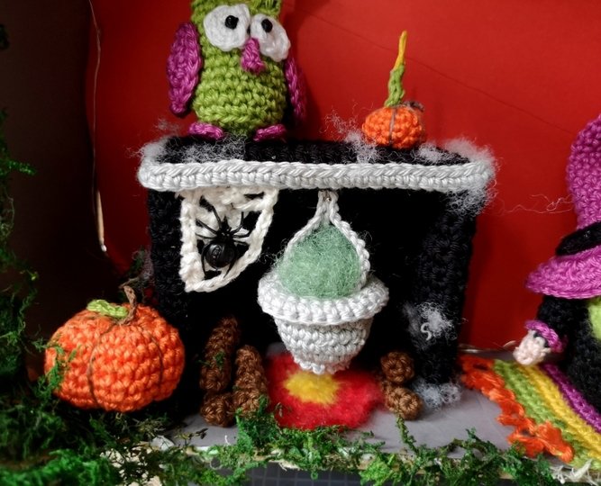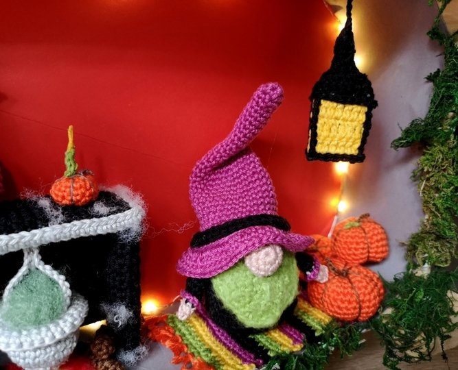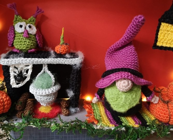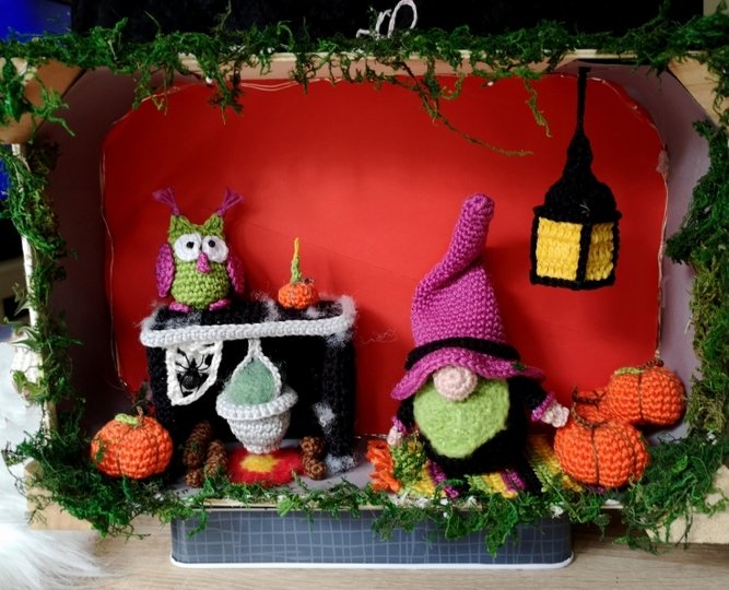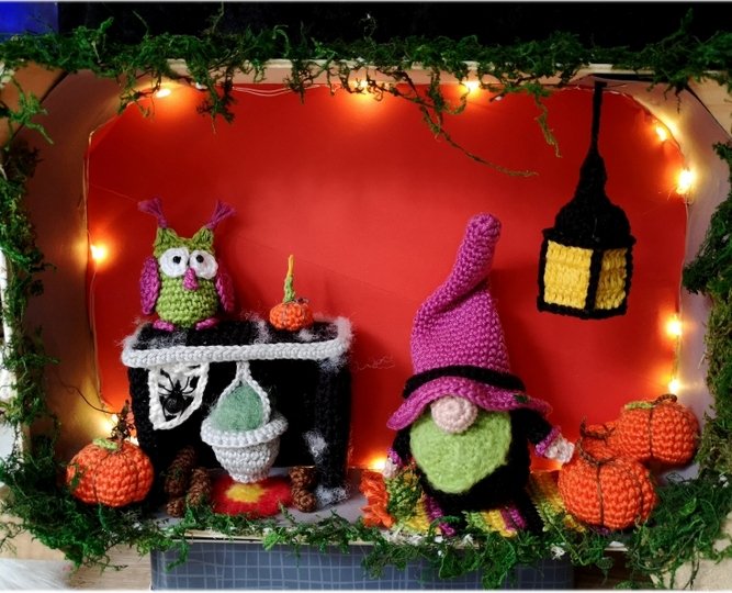 Mit dieser Häkelanleitung können Sie einen kleinen Wichtel inklusive komplett eingerichtetem Stübchen nacharbeiten. Ob Laterne, Kamin mit Kessel und Feuerstelle, Kürbiskerze, Holzscheite, kleine Eule, Teppich und natürlich viele Kürbisse ... alles ist vorhanden. In dieser Anleitung findet der Wichtel sein Heim in einer kleinen Mandarinenkiste, aber selbstverständlich können Sie dies nach Belieben Ihren Wünschen anpassen, wenn Sie gerade keine Kiste zur Hand haben. Happy Halloween wünscht Petras Häkelvergnügen.
