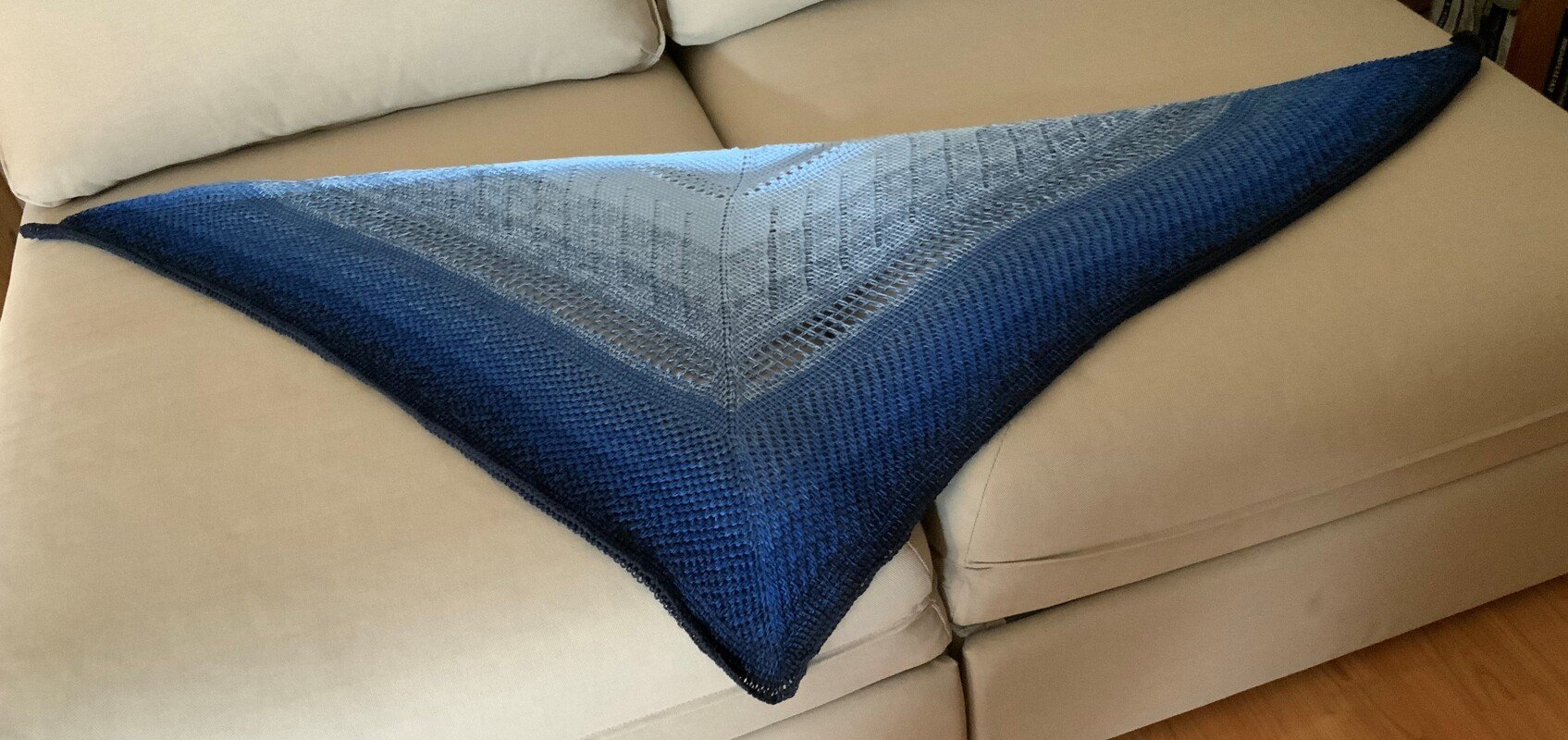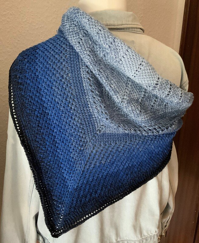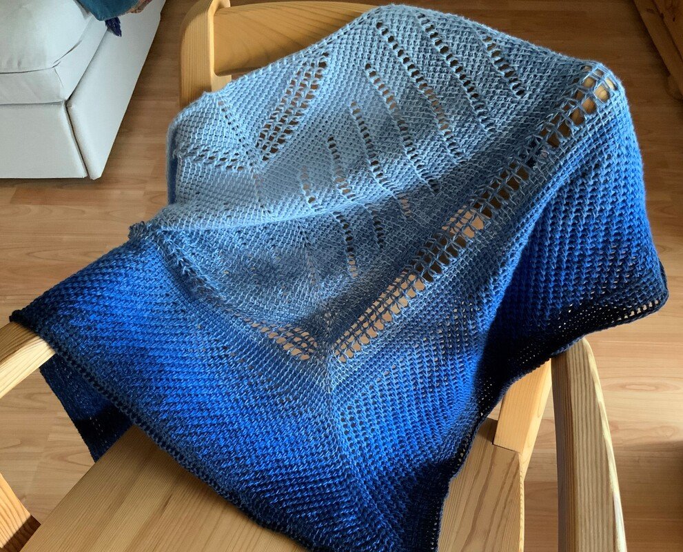Es hat gespannt eine Größe von ca. 75 cm x 160 cm. Das Tuch wird aus der oberen Mitte gearbeitet. Die Form ergibt sich durch Zunahmen an den Rändern sowie rechts und links der Mittelmasche.