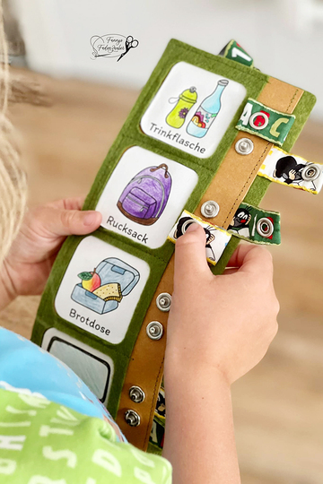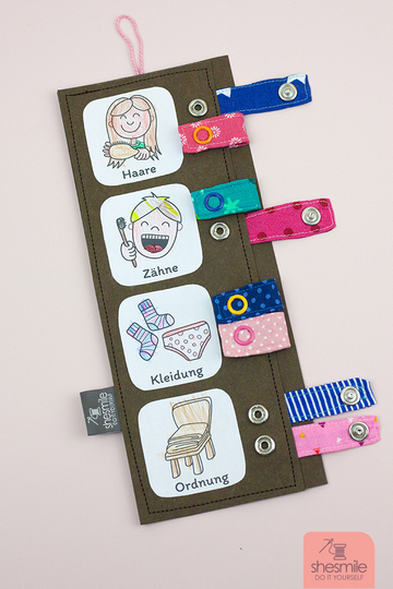 Und hier kommt die Lösung: Die „Kinderleichte Routine“. Genäht aus SnapPap, Leder oder Filz, Stoffresten und Druckknöpfen oder Klettverschluss.