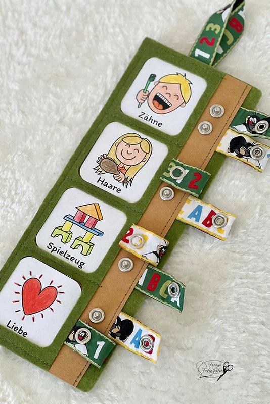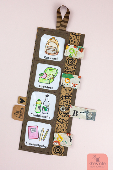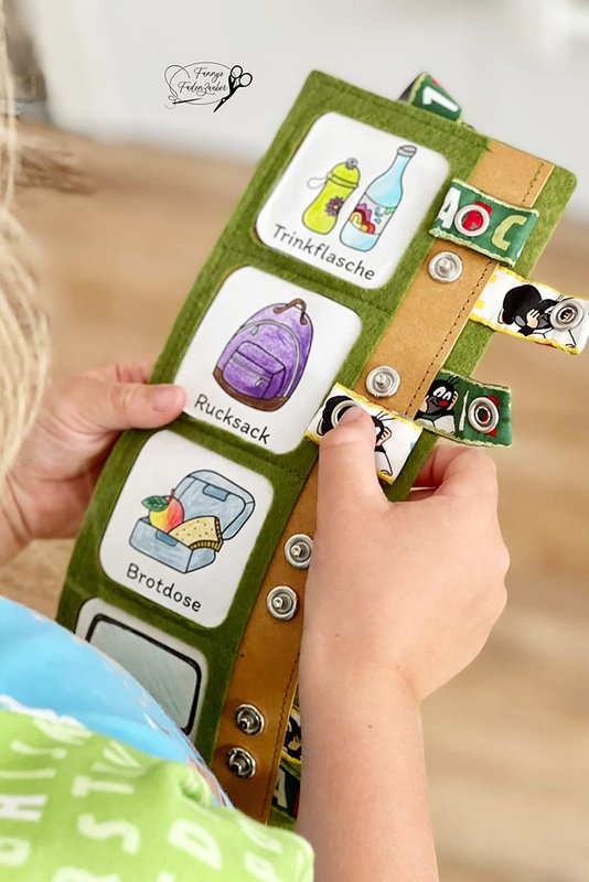 3 Versionen können genäht und gestaltet werden. Feste Aufgaben (aufgenäht oder aufgeklebt) oder flexible Aufgaben zum Tauschen. Mit oder ohne sie zu laminieren. Viele weitere Gestaltungsideen sind beim Probenähen entstanden. Auch diese Ergebnisse sind als Inspiration im E-Book enthalten.