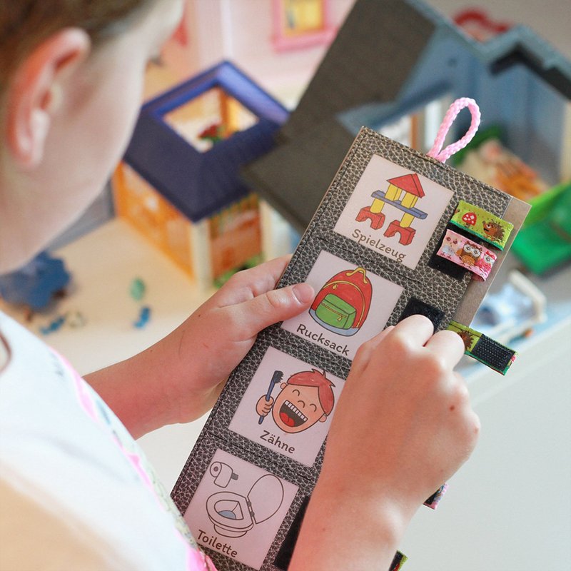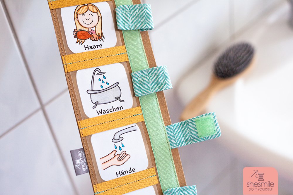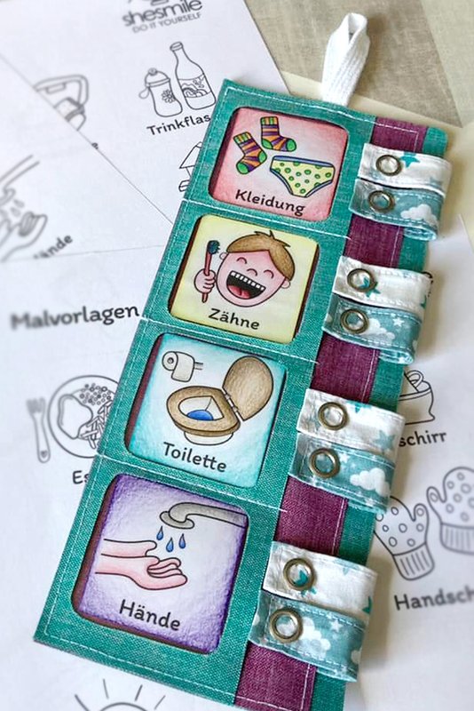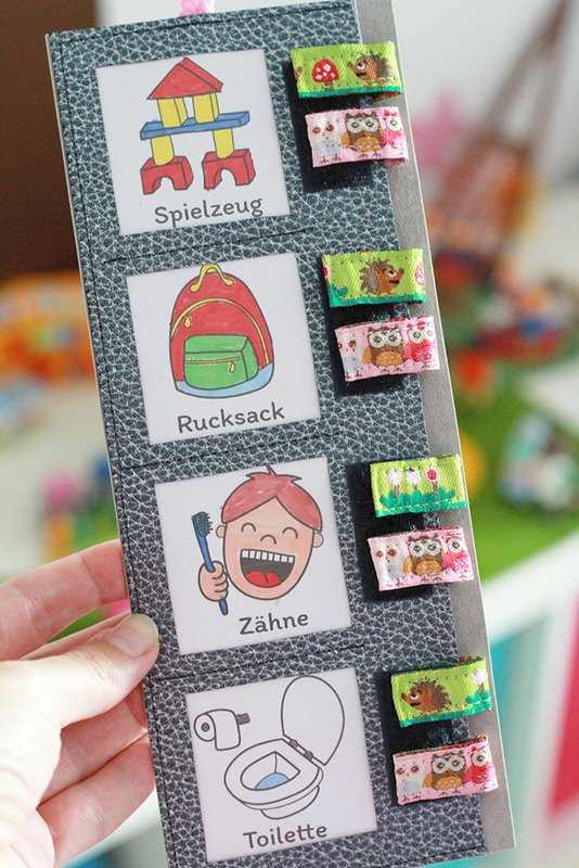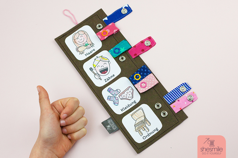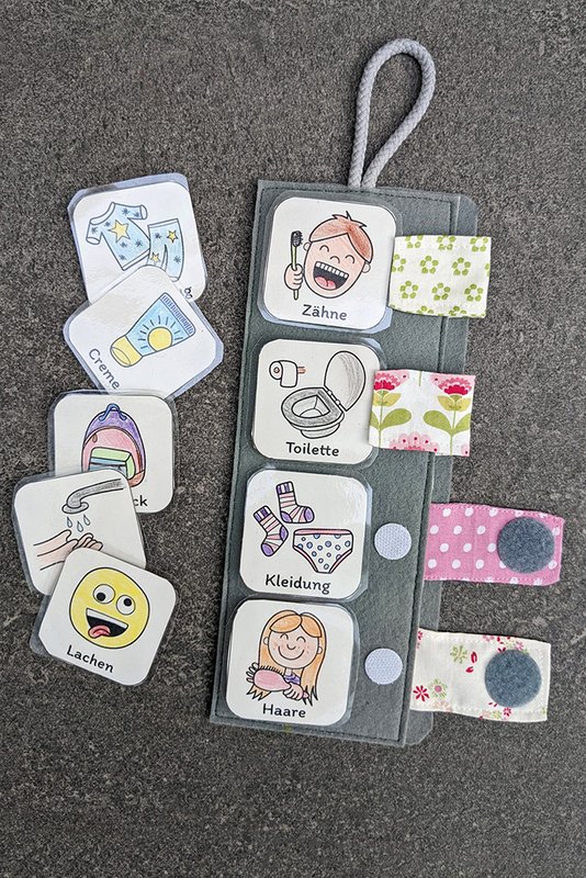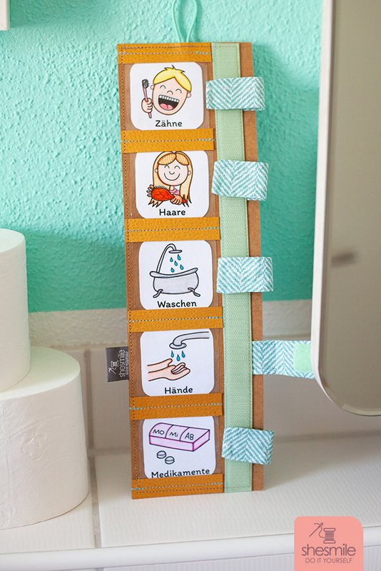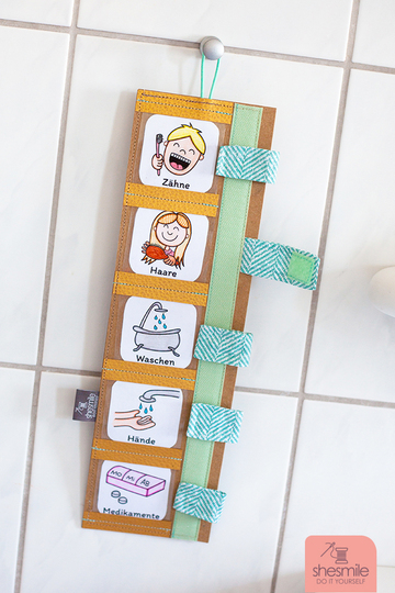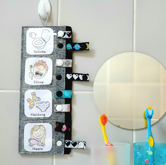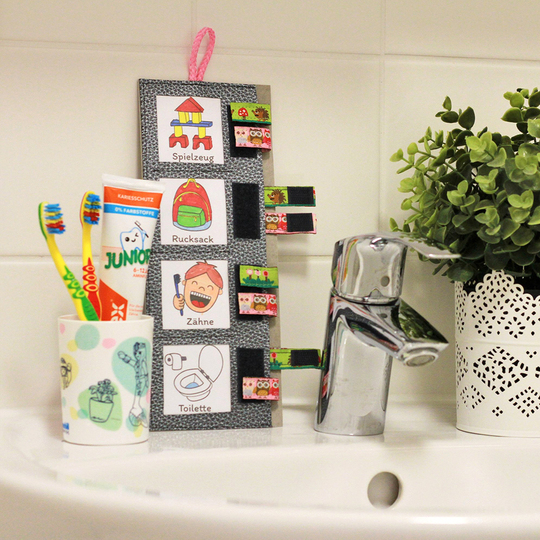 Durch die Bilder wissen auch Kleinkinder sofort was zu tun ist und können die passenden Aufgaben Morgens und Abends einfach selbst abhaken.