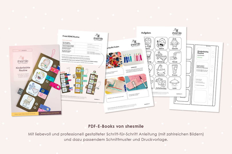 PDF-E-Books von shesmile: Diese leicht verständliche Schritt-für-Schritt-Anleitung mit vielen Fotos ist auch für Nähanfänger geeignet, denn die sehr ausführliche Fotoanleitung begleitet dich bei jedem Schritt.