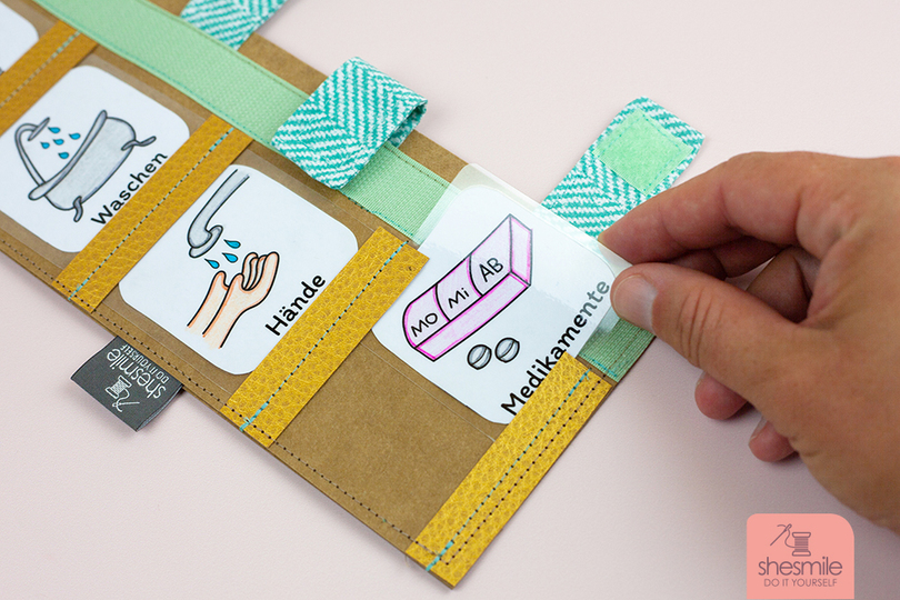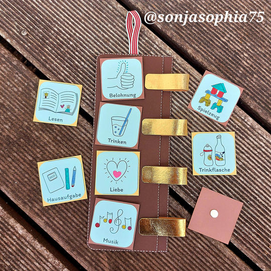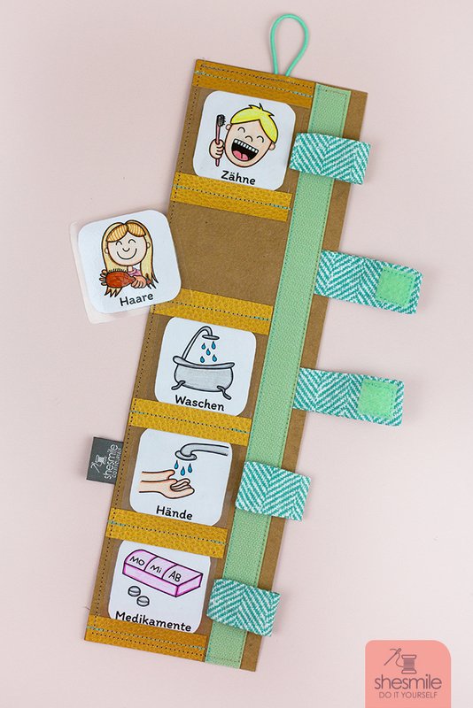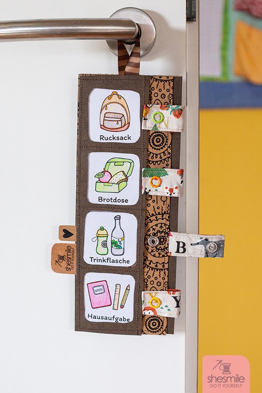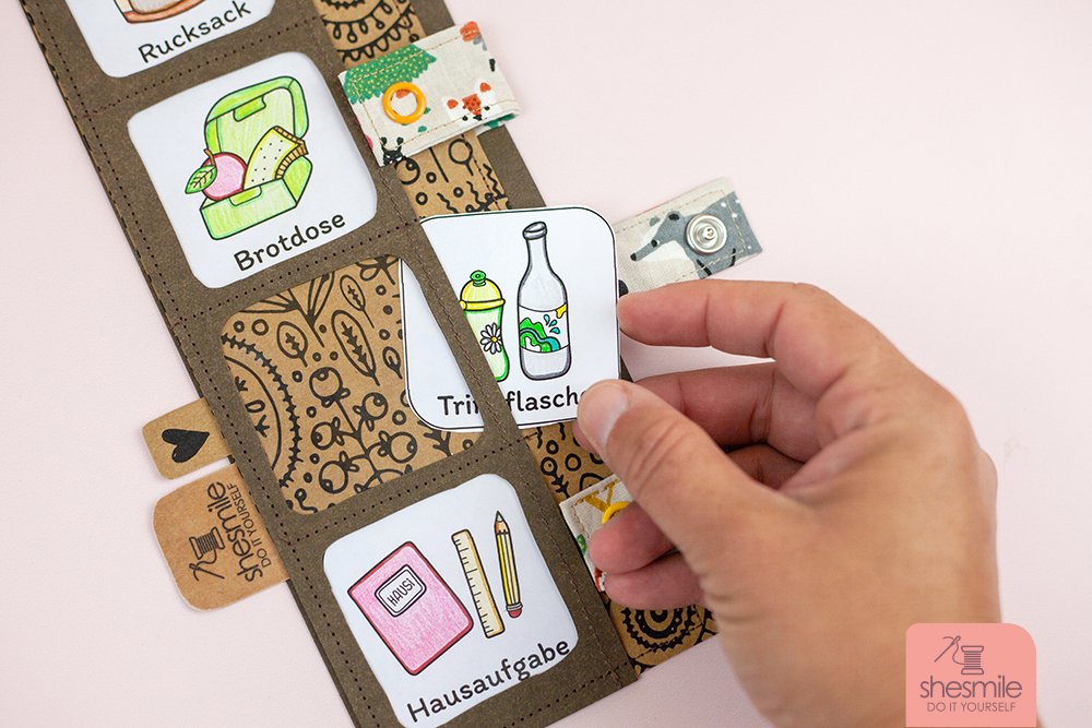 SnapPap als Untergrund. Alternativ: Leder, Kork oder Filz mit Decovil oder Schabracken Einlage S133 verstärkt. Stoffreste aus Webware für die Schlaufen. Druckknöpfe & Druckknopfzange. Alternativ: Klettverschluss. Zierband oder fester, dicker Zwirn als Aufhängung. Nähgarn in passender Farbe. Optional: Textillabel. Bunt- oder Filzstifte, Papierschere. Optional: Folie zum Abdecken um es später abwischen zu können. Alternativ: Gedruckte Fotos der Gegenstände.