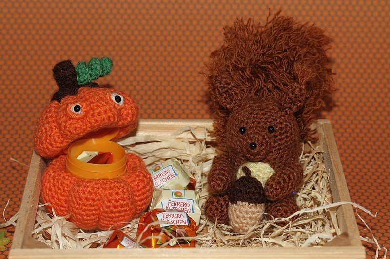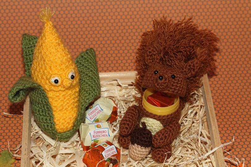 Spätestens zum Herbst ist wieder Handarbeitszeit und was passt da besser als Eichhörnchen, Pilz, Kürbis, Maiskolben und Igel. Die Figuren lassen sich prima aus Wollresten häkeln.