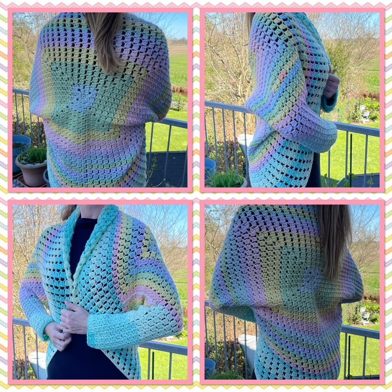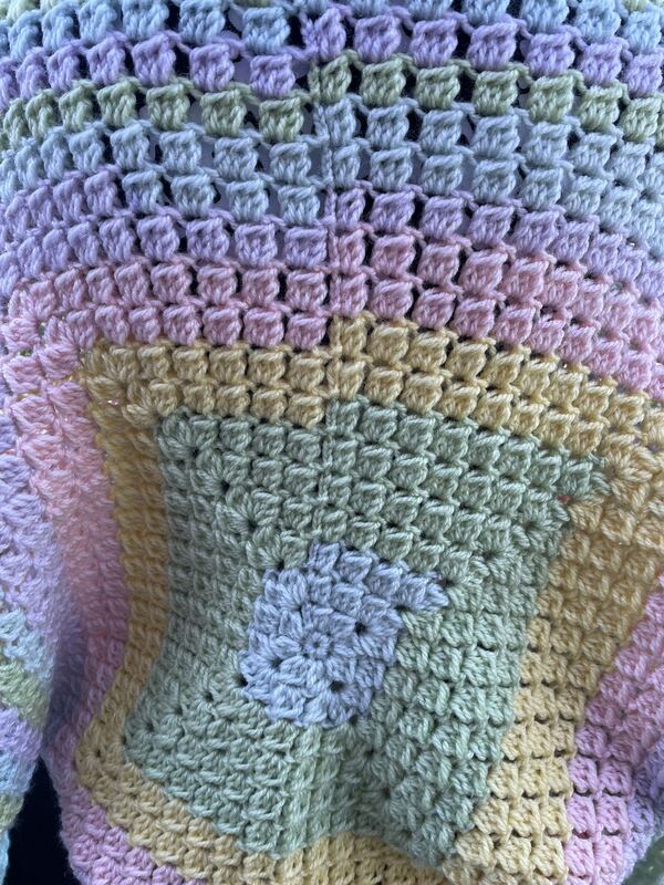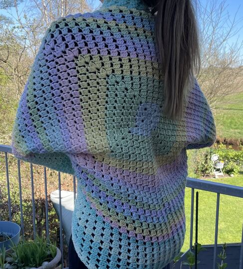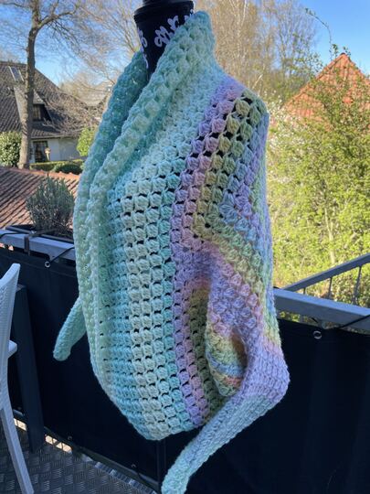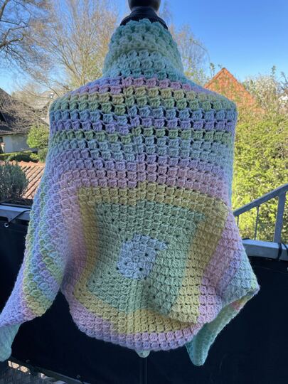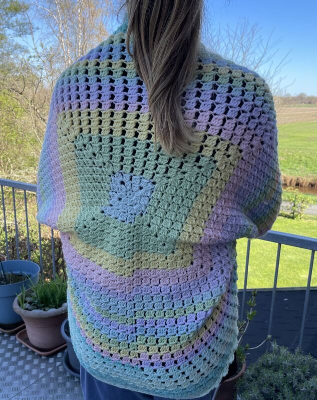 Die Größe kann individuell angepasst werden, indem man das Grundquadrat größer oder kleiner häkelt (mehr oder weniger Runden).
