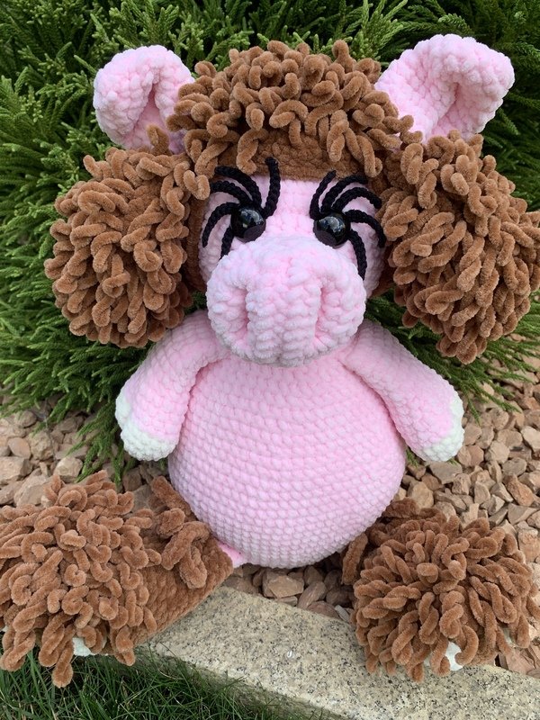 Du bekommst die Häkel-Anleitung für Eberhardt als Schwein mit seiner Verkleidung Hundemütze und Hundefüßen.