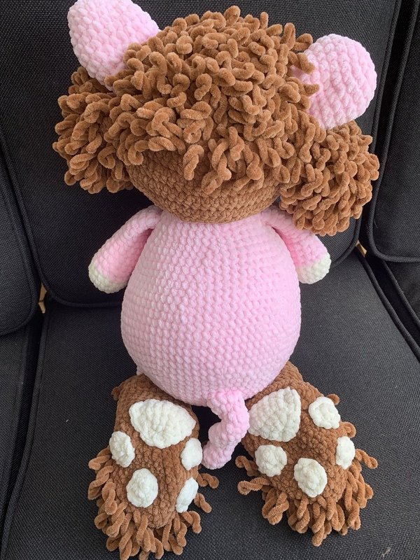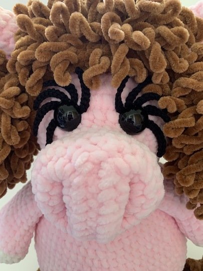 • Himalaya Dolphin Baby – Lauflänge 120m/100g (oder Katia Bambi oder ein anderes Chenille Garn) ca. 180g Braun, 250g Rosa, Rest Natur (ca. 30g), Rest Catania Original Schwarz (für die Wimpern)