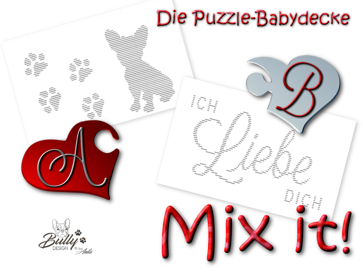 Kombiniere ein Motiv-Teil A mit einem Schriftzug-Teil B aus unserer Mix it!-Serie und bastle dir so deine ganz persönliche Babydecke!