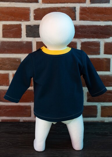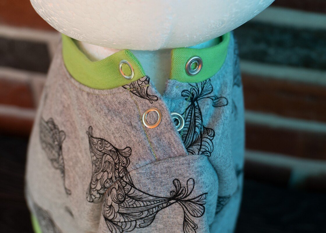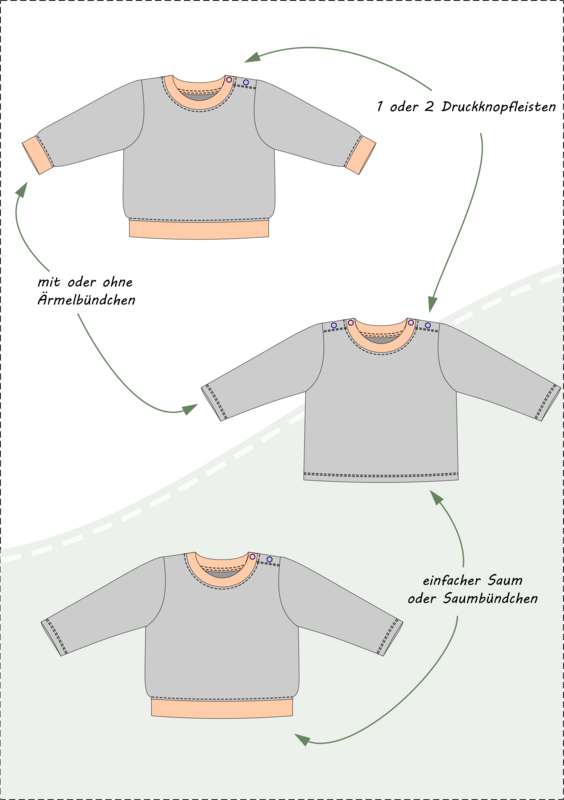 Das Modell „Jojo“ ist ein Basic Pullover für Babys, der wahlweise mit Saumbündchen genäht werden kann. Im Schnittmuster sind gerade Ärmel mit einfachem Saum oder Saumbündchen enthalten. Außerdem hast du die Wahl zwischen 1 oder 2 Druckknopfleisten an den Schultern, wodurch es leichter ist, deinem Baby den Pullover anzuziehen.