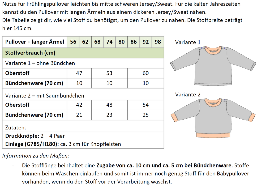 Das Schnittmuster enthält die Größen 56 bis 98 inklusive Nahtzugabe als A4 und A1 bzw. A0 PDF.
