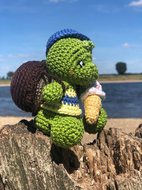 Percy hat eine Größe von ca. 11 cm, je nach Häkelstil, Häkelnadel und Garn.