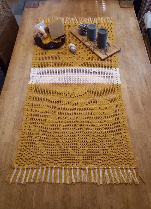 Die 15-seitige Anleitung beinhaltet viele Fotos, eine kurze schriftliche Anleitung und das Diagramm zum Häkeln des Tischläufers.