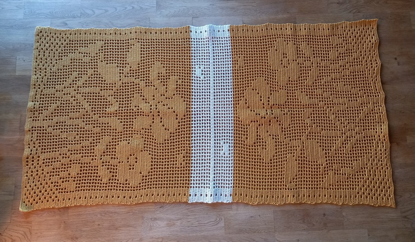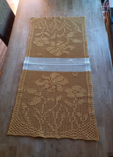 Da ich immer auf der Suche nach einem Tischläufer bin, der auf unseren großen Eßtisch passt, habe ich kein klassisches Filetgarn verwendet, sondern ein etwas dickeres Baumwollgarn (hier das Drops You 9 und das Catania von Schachenmayr).
