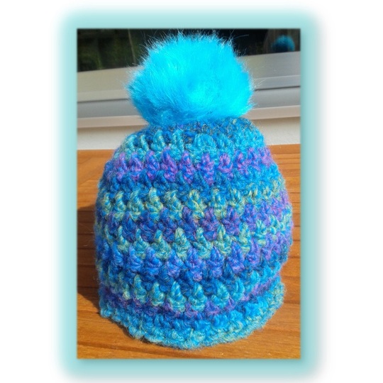 Die Mütze wird mit Nadelstärke 12 gehäkelt, und es dauert nicht lange und Du hast die Mütze fertig.