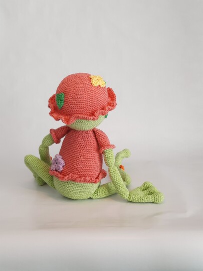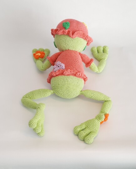 Der Frosch wird mit den angebenen Garn und Häkelnadel 40 cm groß.