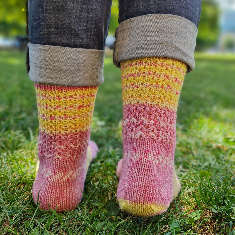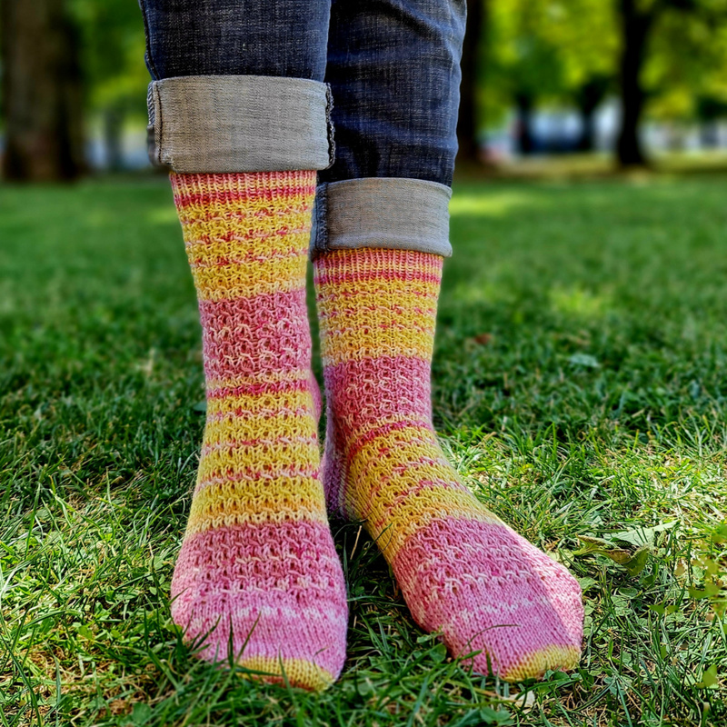 Bei diesen Socken steht die Harmonie zwischen einfachem, aber nicht weniger attraktivem Muster und einem sehr farbenfrohen, mutmachendem Knäuel Sockenwolle im Vordergrund. Ein wirklich tolles Zusammenspiel.