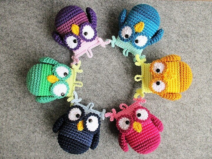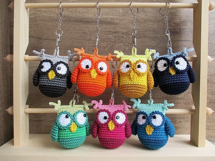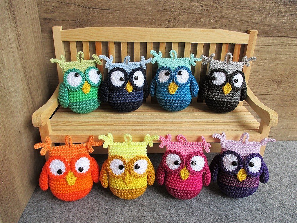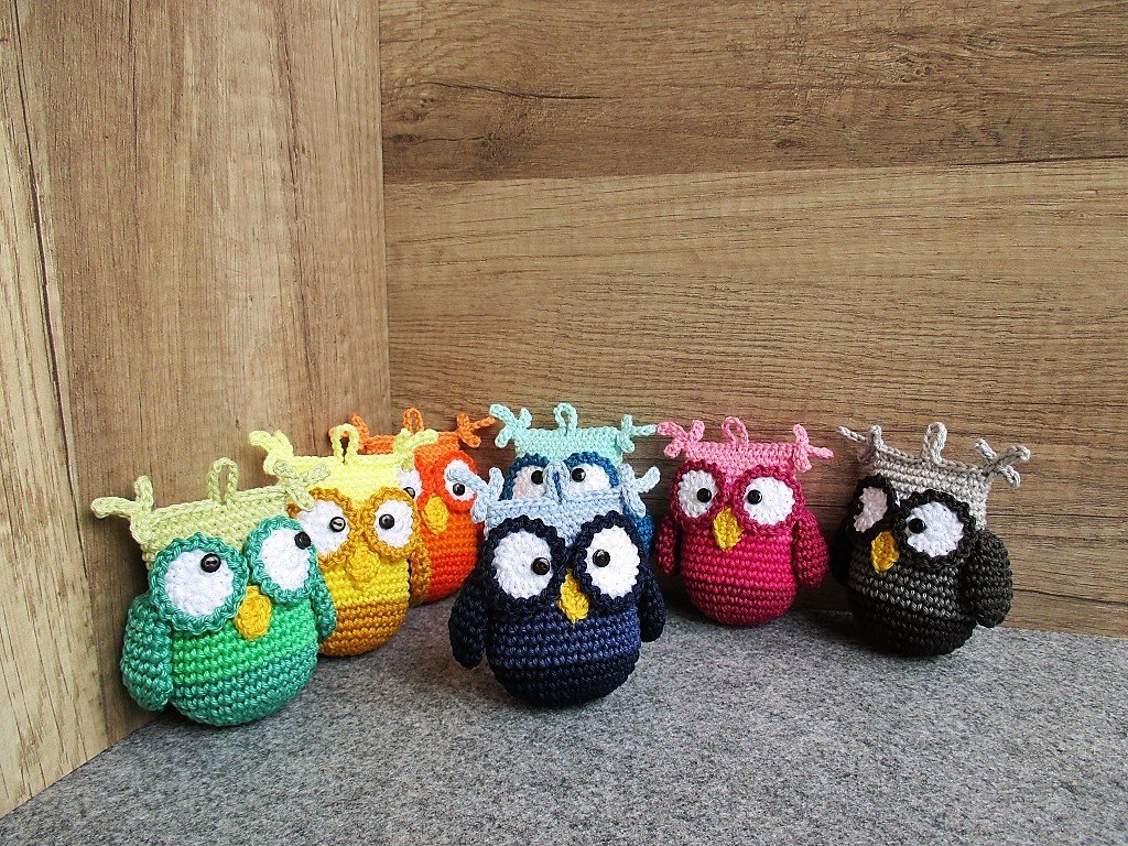 Die kleine Eule wird mit Catania-Baumwolle und Nadelstärke 2,5 etwa 7 bis 8 cm hoch (und breit) und eignet sich als Taschenbaumler, Schlüsselanhänger, für den Rückspiegel als Autodeko, als Anhänger für den KiGa-Rucksack, den Tornister ...