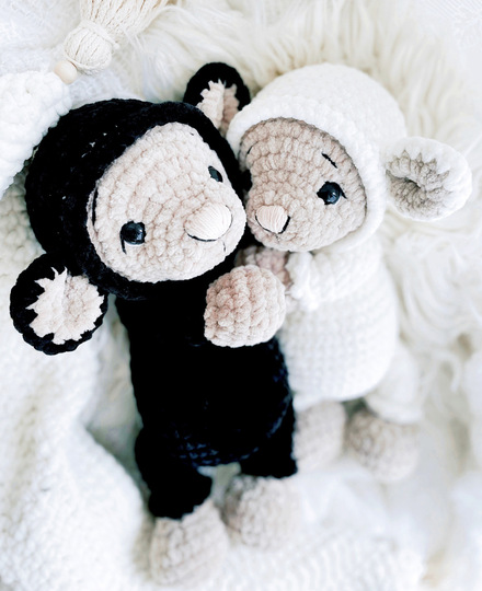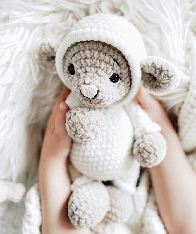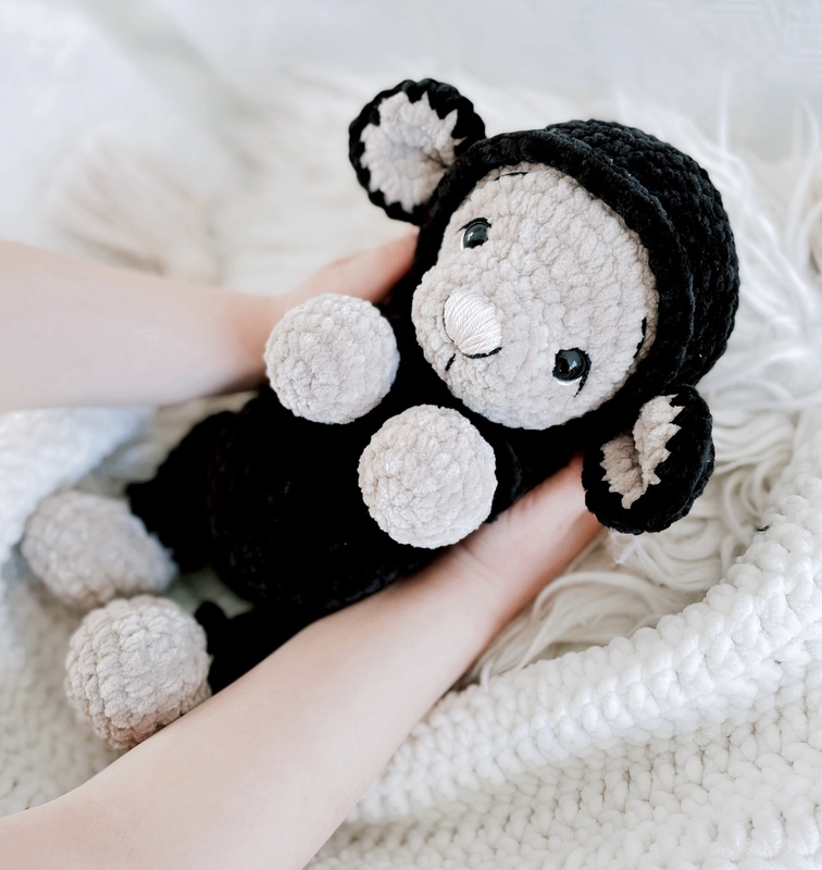 Mit Chenille Wolle wird sie/er ca. 30-40cm groß. Je nach Nadelstärke, Garn und Häkelstärke, kann die Größe variieren.