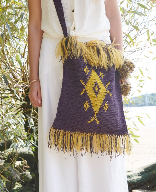 Boho Style der Extraklasse! Das superschöne Motiv wird mit festen Maschen in Jacquardtechnik nach Zählmuster einfach geradeaus gehäkelt. Bunte Fransen und Pompons unterstreichen den Look.