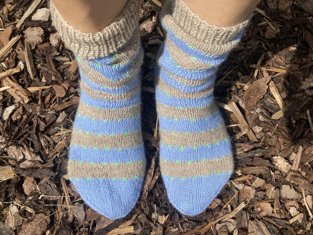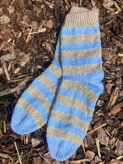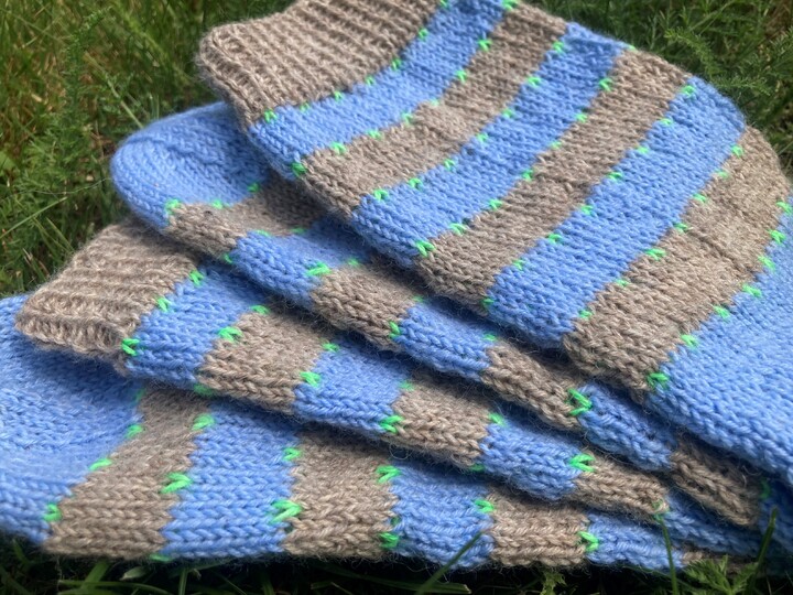 Einfache Socken im Streifenmuster mit einer zusätzlichen Masche farblich abgesetzt, verleiht dem Sockenpaar das gewisse Etwas. Je nach Farbzusammenstellung wird Deine Socke immer wieder anders aussehen.