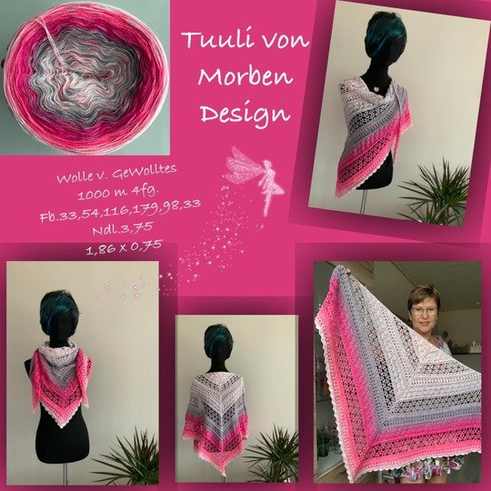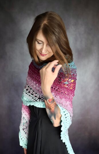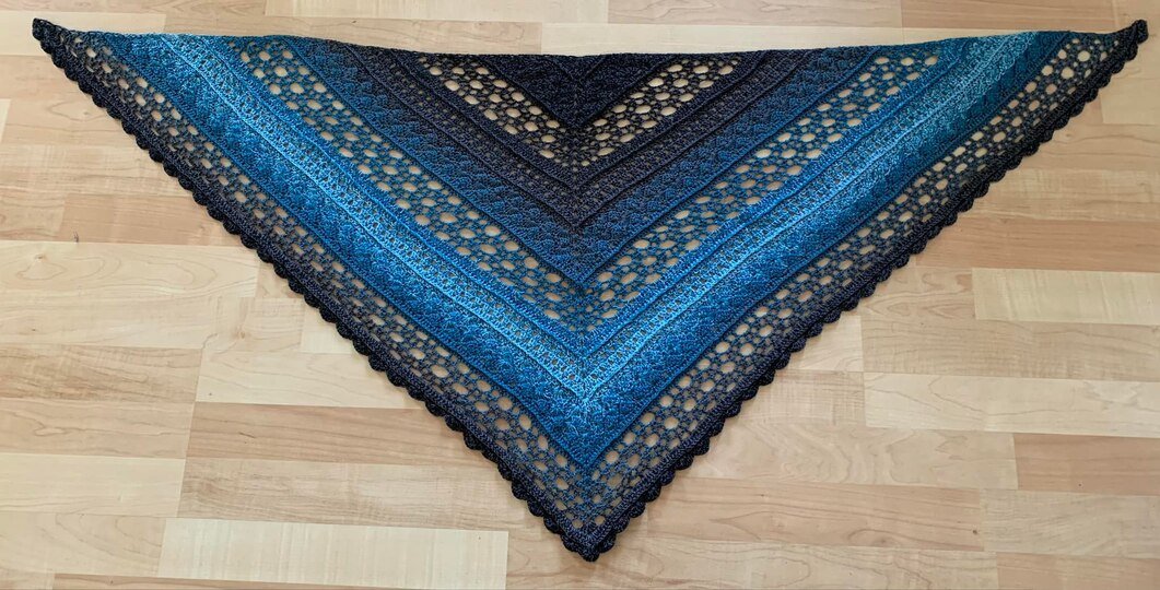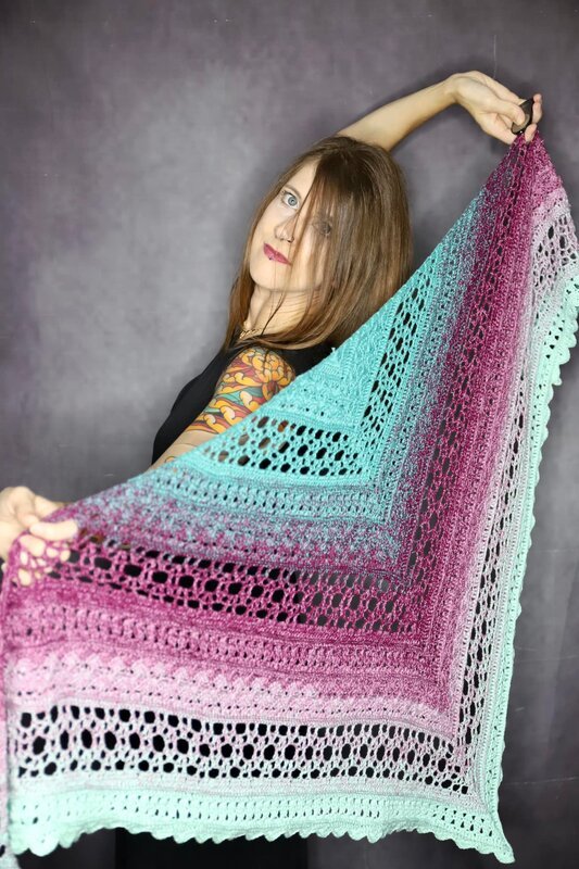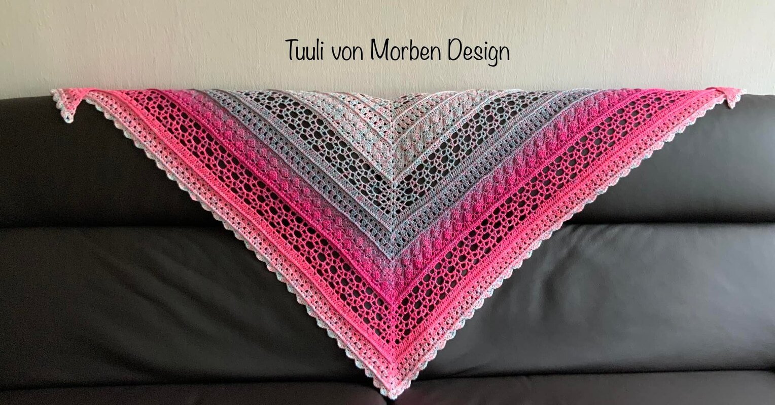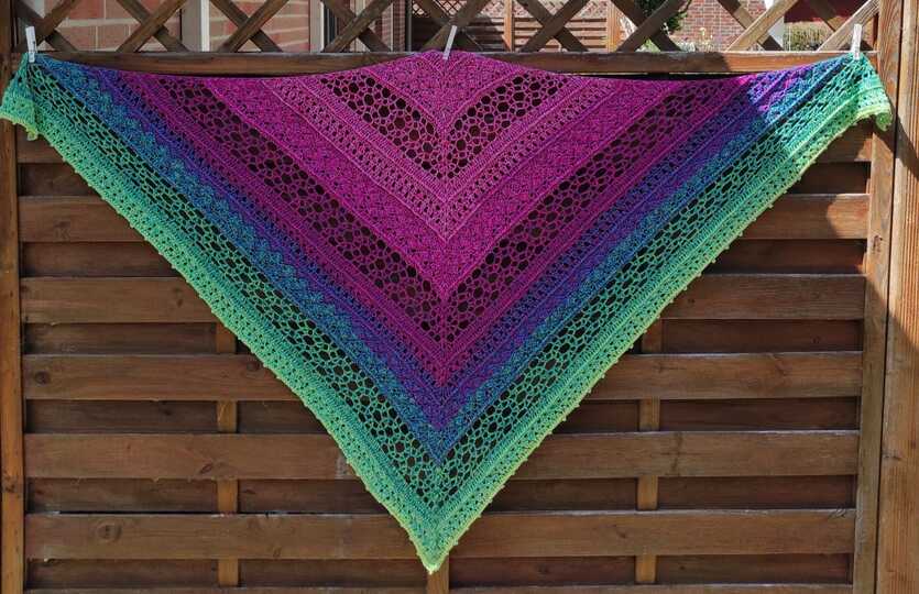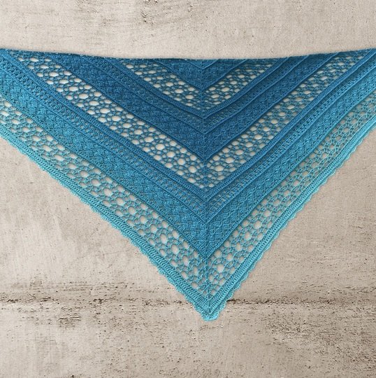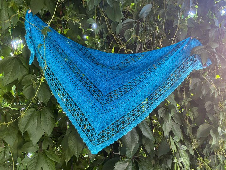 Noch ein leichtes Tuch für den Sommer, in der klassischen Dreiecksform. Die Anleitung ist für 59 Reihen in schriftlicher Form und mit Häkelschrift aufgeführt. Ideal für 1000m Lauflänge