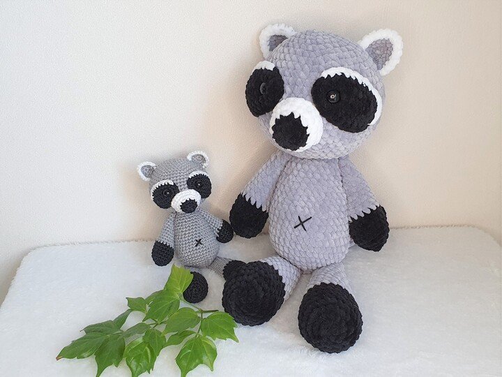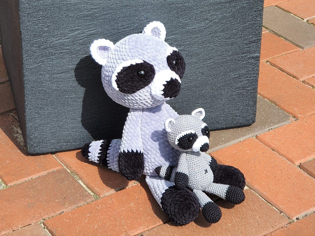 Bei Verwendung der angegebenen Wolle und Häkelnadelstärke ist der große Waschbär nach Fertigstellung ca. 33cm groß, der kleine Waschbär wird ca. 17cm groß.