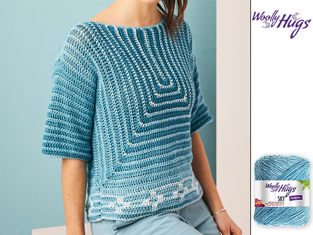 Dieser hübsche Pulli besticht durch seine interessanten Linien. Sie sind nicht einfach gerade, sondern betonen die Machart. Gehäkelt wird von oben nach unten. Zum Schluß wird eine schöne Brorüre gehäkelt die dem Pullidesign als ganzes abrundet.
